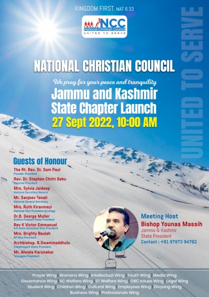 Jammu and Kashmir needs our prayers for much peace to return there that is long due. All NCC Leaders and others are invited cordially to please plan to be there in Jammu for the launch of Jammu and Kashmir state launch on 27th September 2022 at 10:00 am. For this trip we have no Travel Subsidy so individual leaders have to bear their own travel and lodging expenses there. All the coordination and bookings will be helped by the local leaders after the leaders agree for the prices of the establishments there. Kindly prayerfully plan to be there and to pray for peace and tranquility of J & K and for our brothers and sisters there and for the state to progress and develop in all aspects. For further details you may contact the following: Mr. Manoj Bob NCC IT Director, Coordinator of this meet on: This email address is being protected from spambots. You need JavaScript enabled to view it. or This email address is being protected from spambots. You need JavaScript enabled to view it. Ph and Whatsap: +91-98666 66683