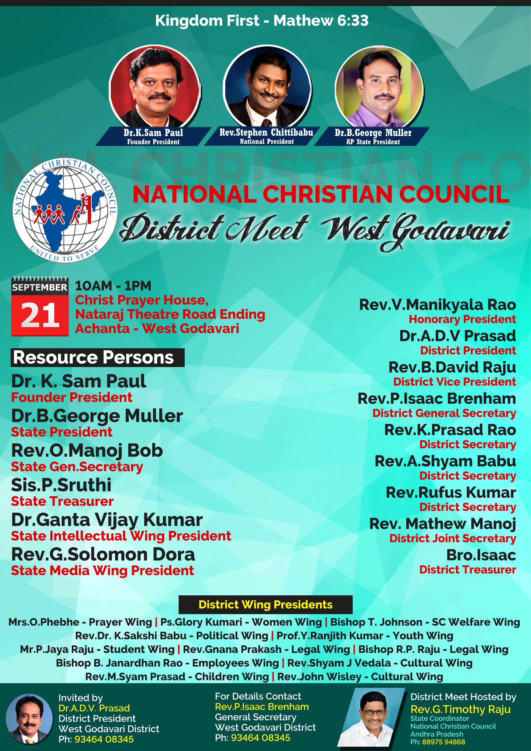 "National Christian Council exists to serve the Minorities by uniting and developing the leaders in the Church. It is human rights network to promote communal harmony and understanding between the communities and to address the issues of any atrocities on the minorities in particular Christians."