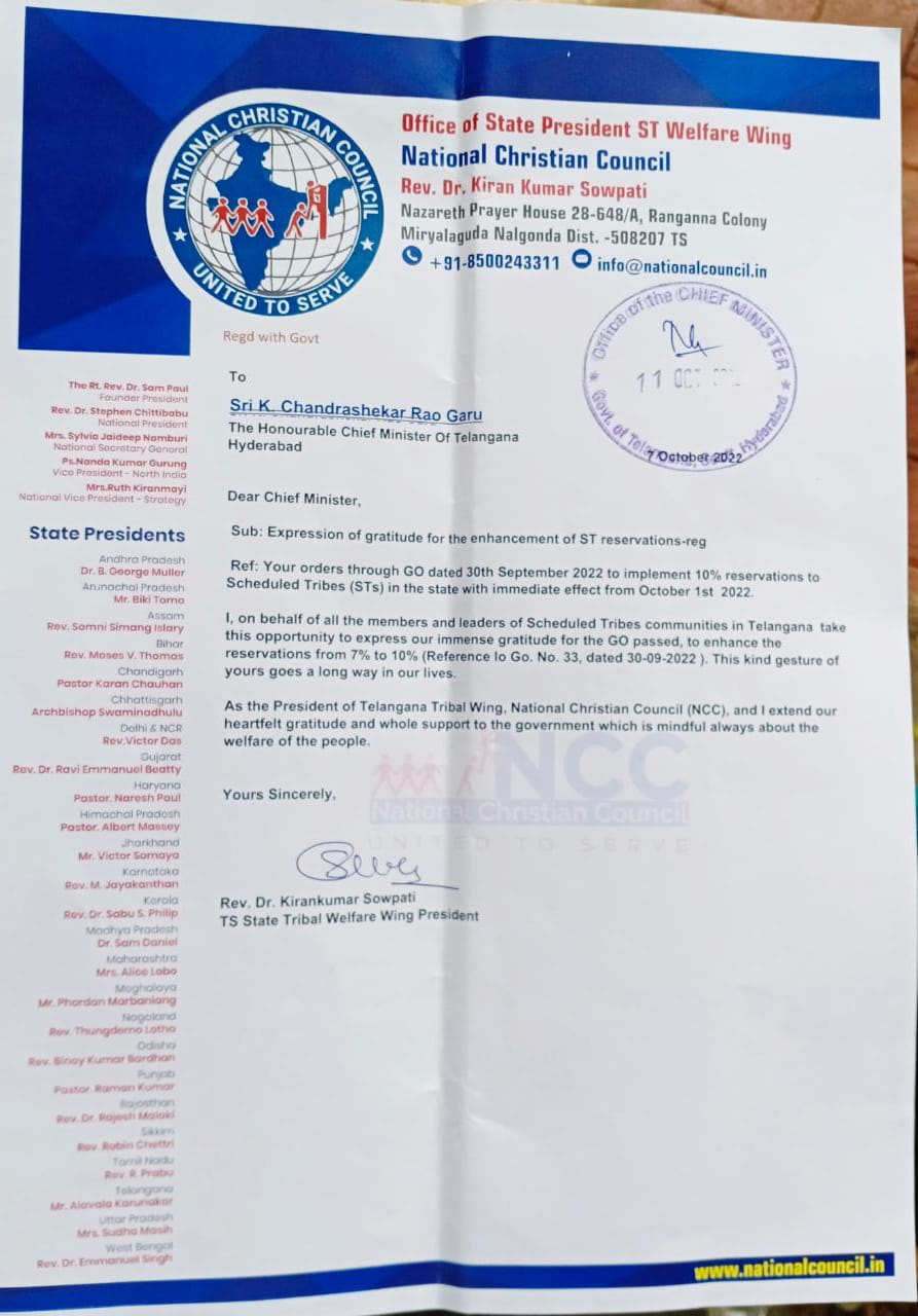 In a letter of thanks and appreciation NCC Telangana State ST Welfare Wing President Rev. Dr. Kiran Kumar Sowpati thanked the Chief Minister for this gesture towards the State’s Tribal population.